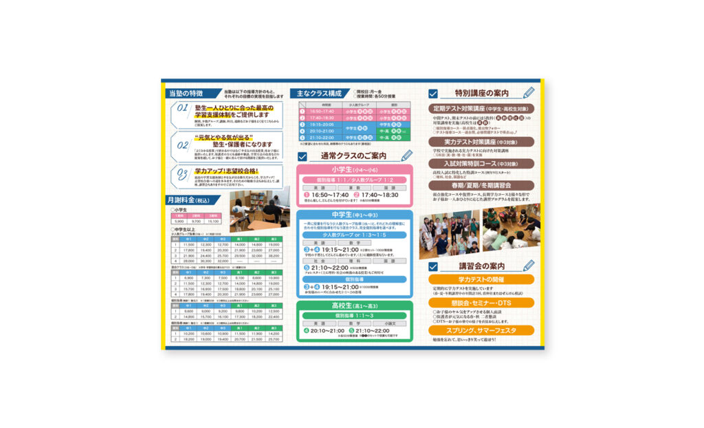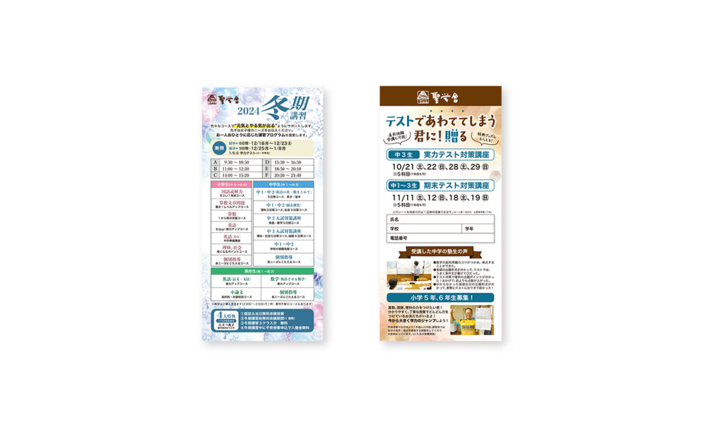 夏期講習・冬季講習などの期間限定プログラムは、A4巻三つ折りに挟み込めるサイズにし、毎回アップデートができるようにしています。