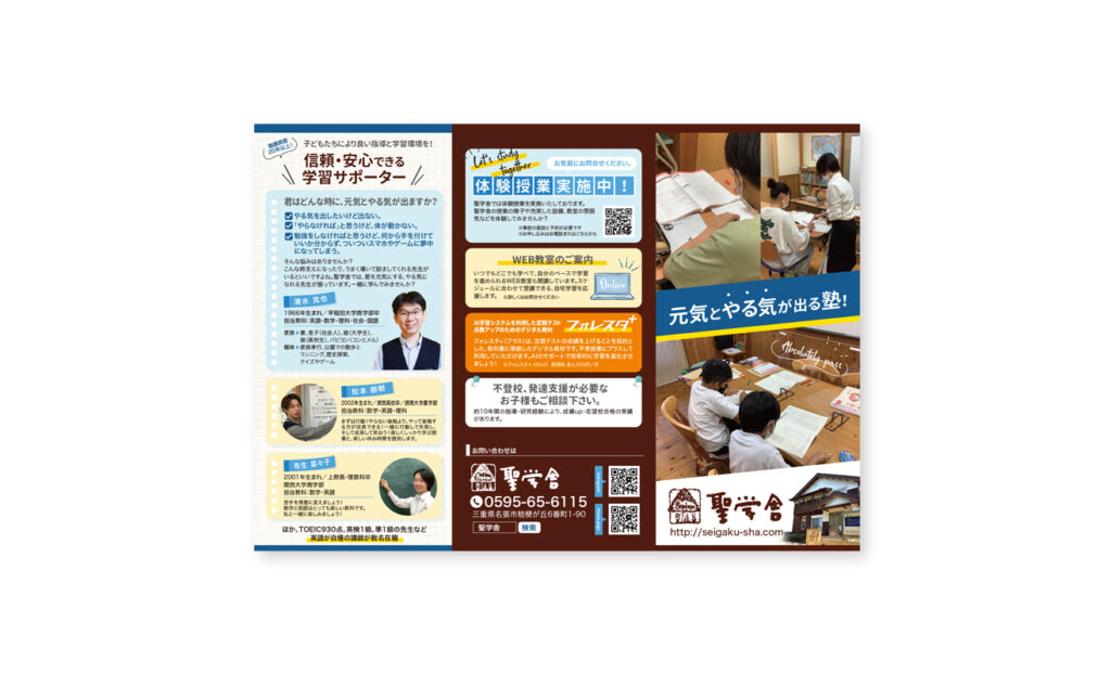 三重県名張市桔梗が丘にある学習塾「聖学舎」様のパンフレットをデザインさせていただきました。