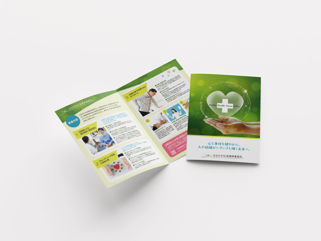 三重県伊賀市・名張市を中心に、中小企業様の健康管理業務をサポートされている「はるのやね保健師事務所」様の事業紹介パンフレットを制作させていただきました。
