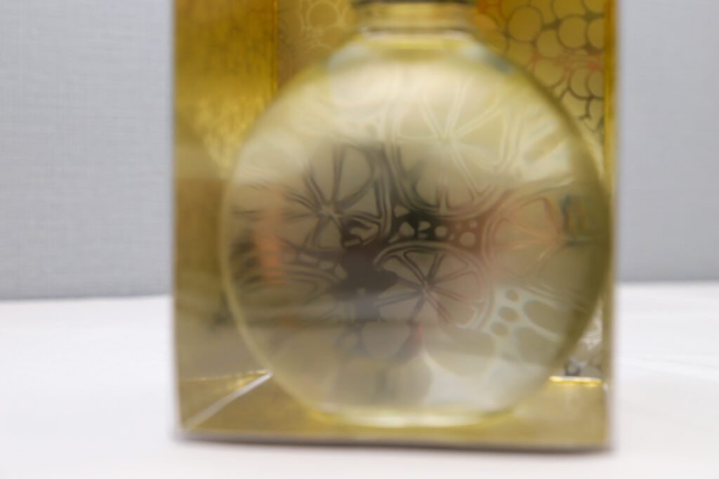 コロンとまるいボトルを正面からのぞくと、魚眼レンズ(虫眼鏡?)の様になっていて、パッケージの模様が拡大されて見えるんです。