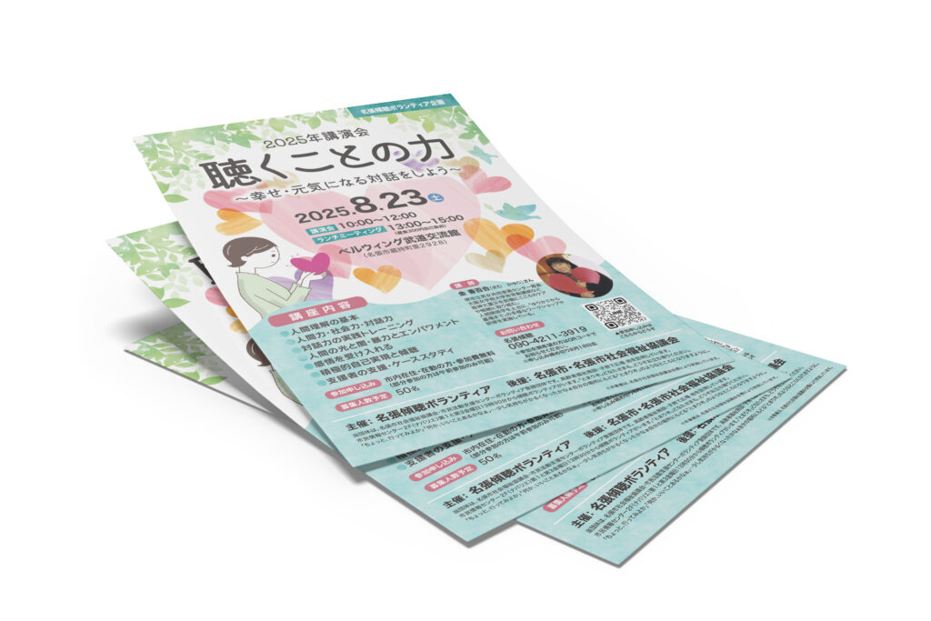 名張傾聴ボランティア 様が主催する「聴くことの力」2025年講演会のチラシを作成させていただきました。しんどい時にふと立ち寄ることで、ちょっと気落ちが軽くなるような「とまり木」のような存在にとの思いで活動されているとのことで、優しいやわらかいイメージに鳥が集まってくる、そんなデザインにさせていただきました。